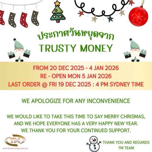 1. เวลาทำการ คือ จันทร์-ศุกร์ เวลา 10.00 am - 18.00 pm ตามเวลา Sydney/Melbourne Australia (กรุณาตรวจสอบรายละเอียดการโอนเงินของท่านให้ถูกต้องเรียบร้อย หากมีข้อผิดพลาดในการโอนเงินอันเนื่องมาจากการเลือกหรือกรอกบัญชีปลายทางผิด ถือว่าท่านผู้ขอใช้บริการตกลงรับผิดชอบการกระทำดังกล่าว : หลังจากการตรวจสอบและอนุมัติเงินเสร็จสิ้น รายการของท่านจะไม่สามารถทำการยกเลิกหรือแก้ไขทุกกรณี)